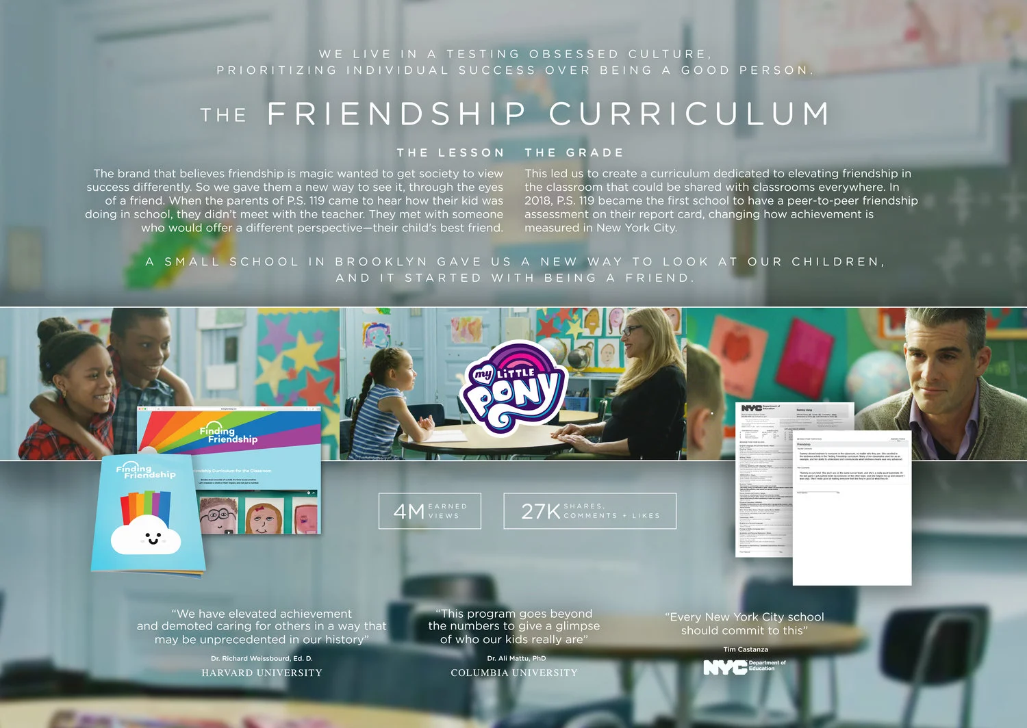 We live in a testing obsessed culture, prioritizing individual success over being a good person. My Little Pony believes friendship is magic, and it wanted to get society to view success differently. So we gave them a new way to see it, through the eyes of a friend.